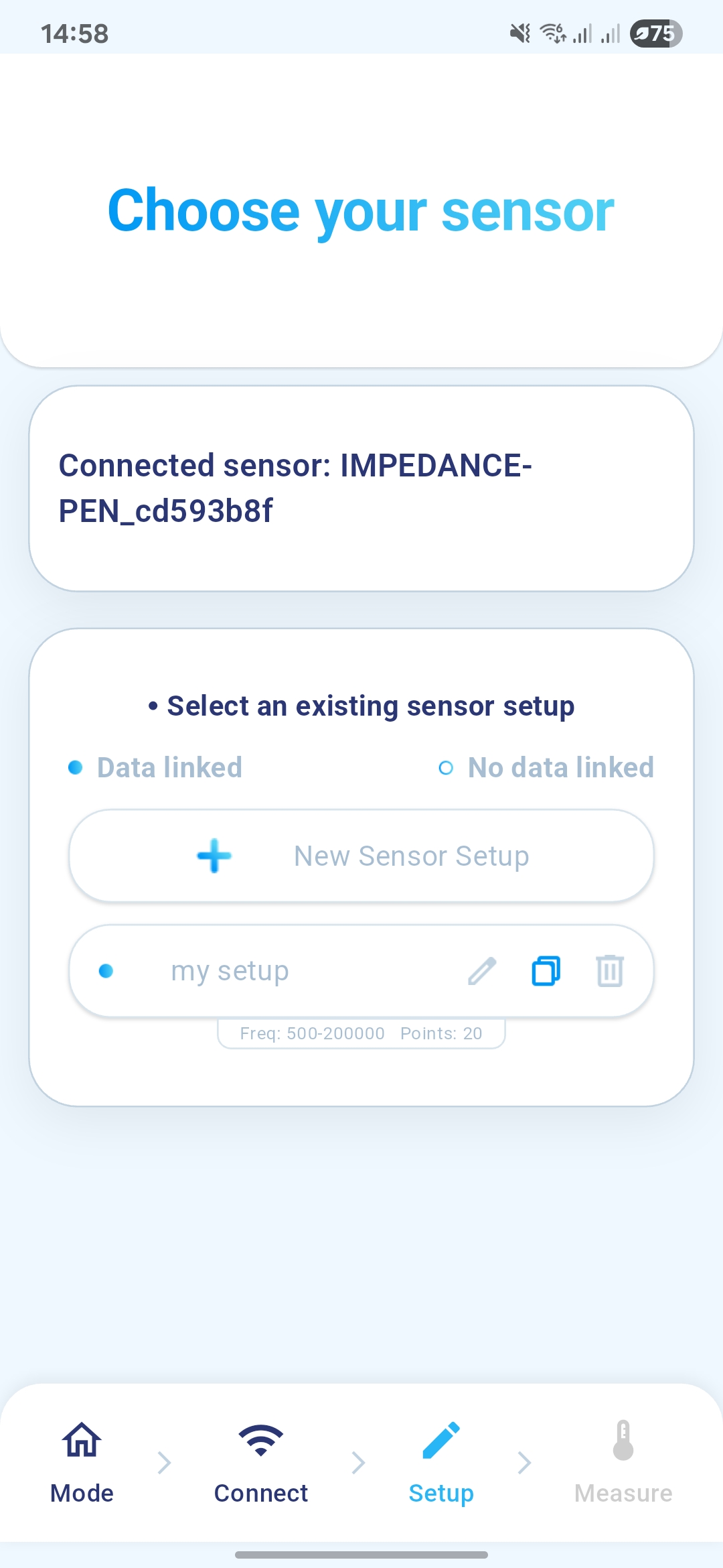 ℹ️ If a Data linked blue dot appears to the left of the sensor setup, this indicates that measurements have already been taken using this specific sensor setup variant. You can either reuse it for a measurement or duplicate it to create a new variant based on it. However, the original setup cannot be modified.