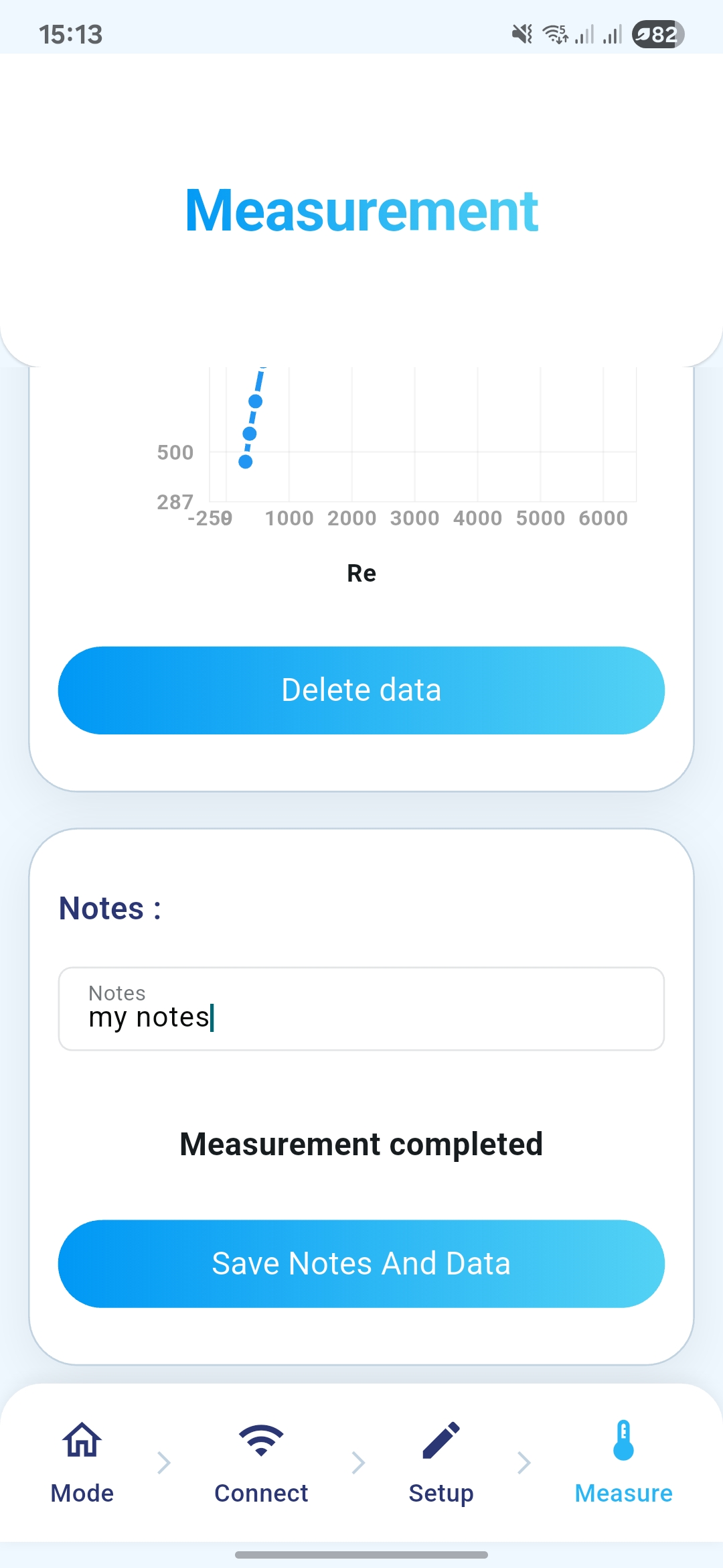 - Step 4 : Observe your results. You can restart an acquisition, delete the current one, or optionally add notes. To save the data to the cloud, click the dedicated save button. You can to start a new measurement if desired.